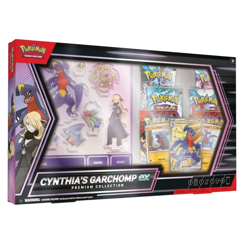 W zestawie Cynthia’s Garchomp ex - Premium Collection znajdziesz wyjątkową kartę promo Garchompa ex, który potrafi nie tylko zadać ogromne obrażenia, ale także pomóc Ci szybciej dobrać potrzebne karty. Wraz z nim otrzymujesz Gible’a i Gabite’a w formacie foil, kolorową naklejkę, akrylowe stojaki i paczki boosterów (każdy z 10 losowymi kartami Pokémon TCG), dzięki którym rozbudujesz swoją kolekcję.